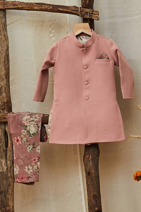 Baby pink solid achkan featuring a mandarin collar and full sleeves. Paired with floral printed pajama in cotton silk fabric.