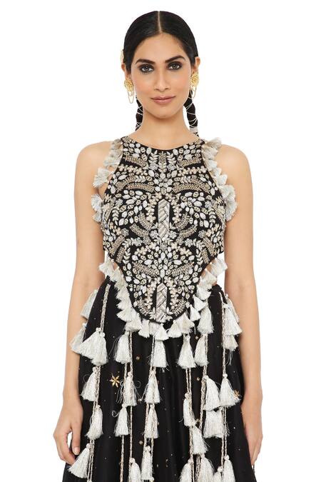 Black backless choli in georgette base fabric with embroidered details. Paired with mukaish silkmul lehenga with tassel embellishments.
