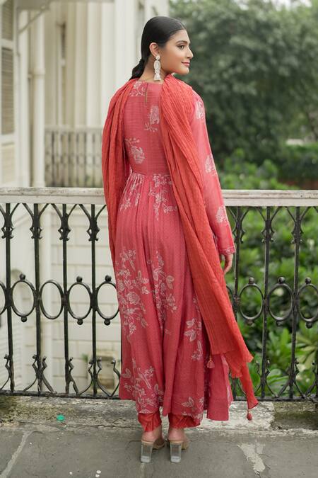 Red chanderi anarkali featuring all-over floral blossom prints and badla work on the yoke. Paired with a crushed dupatta and pant.