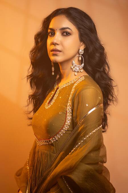 Olive green anarkali featuring scattered mirror work with thread, pearl, pita embroidery on the yoke and sleeve hem. Paired with a matching pant and a dupatta adorned with gota lace and tassel details.