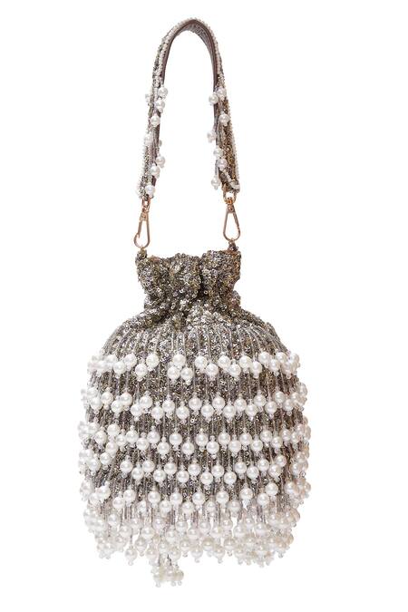 Silver potli bag adorned with intricate pearl tassels and embroidery