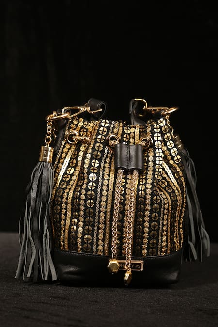 Black bucket bag featuring sequin, zari thread, and gota patti embroidery in a stripe pattern