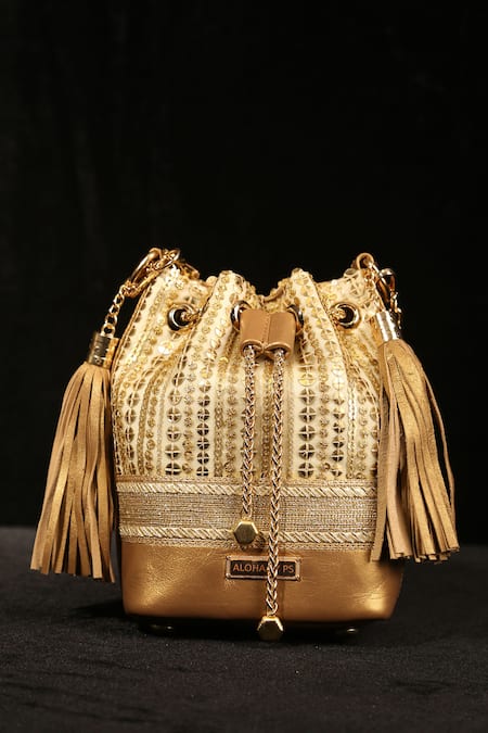 Gold bucket bag featuring sequin, zari thread, and gota patti embroidery in a stripe pattern