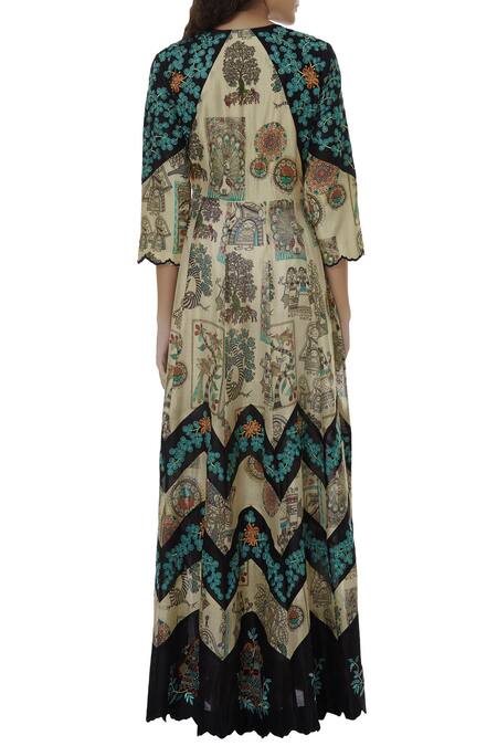 Beige & black hued flared tunic with all over prints & placement embroidered detail.