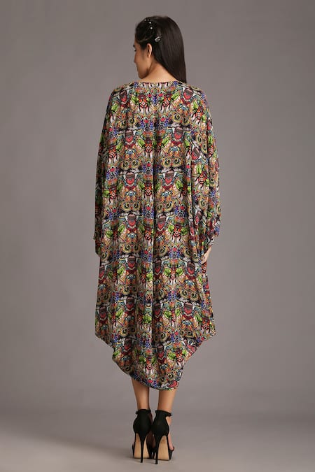 Multicolored dress with beetle print, front slit & V neck.