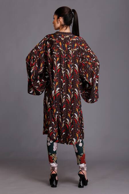 Brown overlap sumo style embroidered jacket in leaf printed motifs.