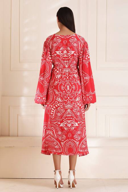 Red Rayon Cotton Ocean V Neck Print Flared Sleeve Dress