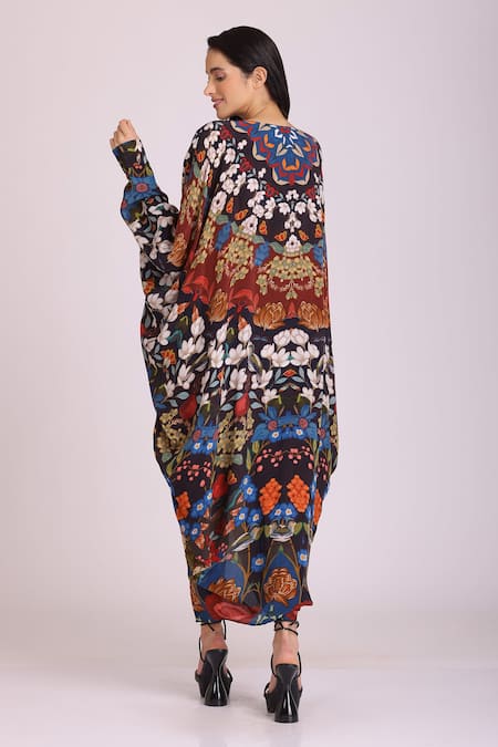 Multicolor dress with floral printed motifs, flared sleeves & V neckline.