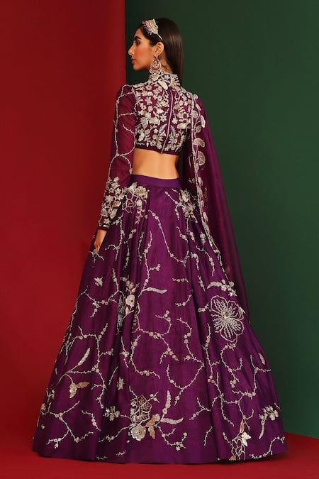 Wine Raw Silk, Organza, Shantoon Floral Alyssa Embroidered Bridal Lehenga Set