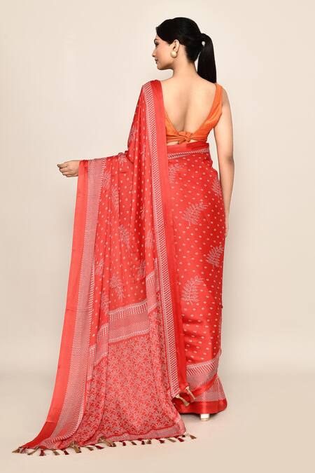 Orange chiffon saree featuring leaf and circular prints with tassel detailing on the pallu hem. Comes with a running jacquard blouse piece.