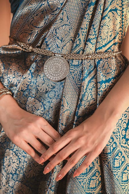 Deep ocean blue pure katan silk saree featuring gold-silver zari floral motifs. Paired with a running blouse piece measuring 1 meter.