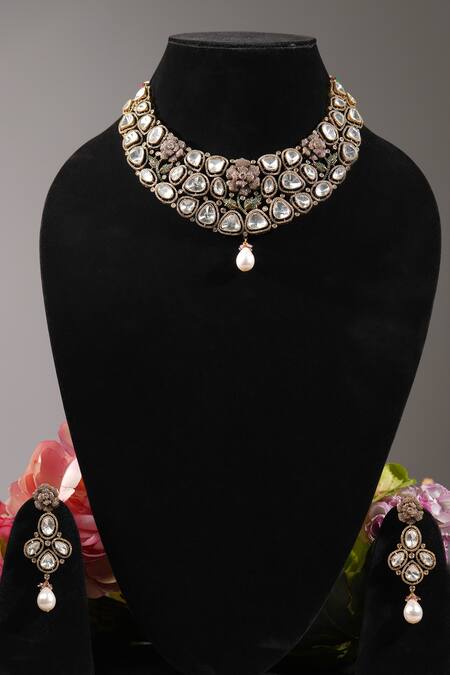 Gold and silver tone abstract cutwork necklace featuring stone, zircon, moissanite polki, and pearl embellishments. Paired with matching earrings that complement the necklace design.