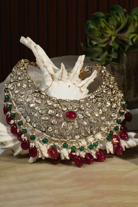 Floral carved design with ruby stones, Dori closure for necklace, Pearl and polki embellishments