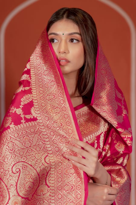 Deep pink pure katan silk Banarasi handwoven saree featuring floral motifs with meenakari hues. Includes a running blouse piece measuring 1 meter.