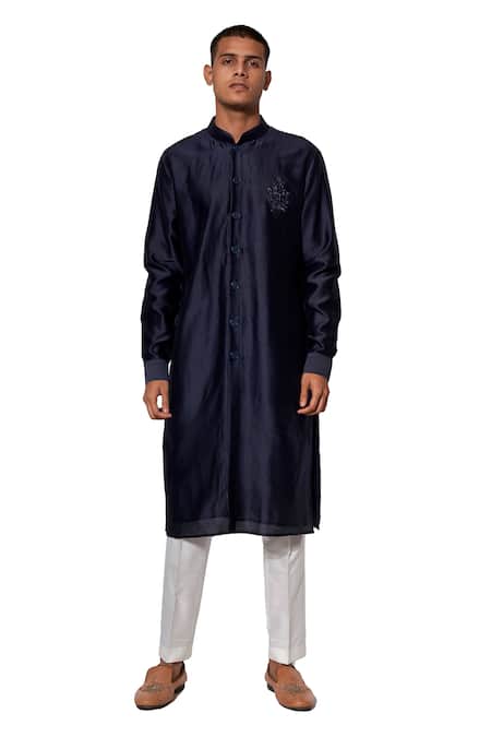 Navy blue front open kurta with placement floral motif bead work. Comes with contrast pants.