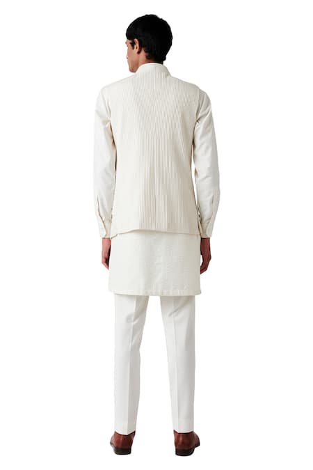 Pearl white asymmetric bundi with geometric embroidered motifs, striped panel & band collar. Paired with cuff button placket, striped kurta & pant.