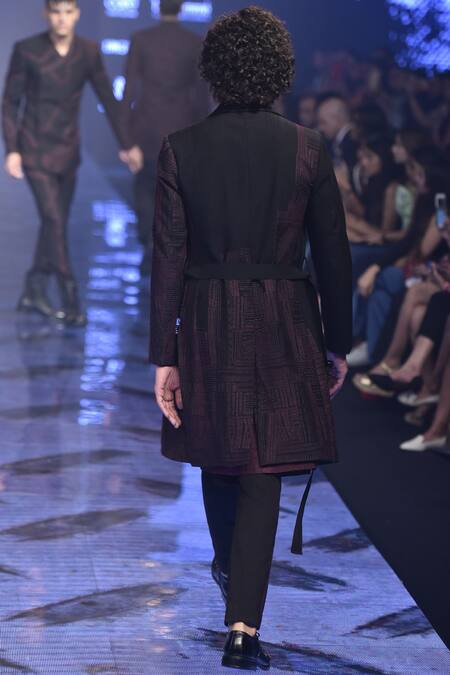 Wine & black long jacket with button front detail. Paired with straight pants.