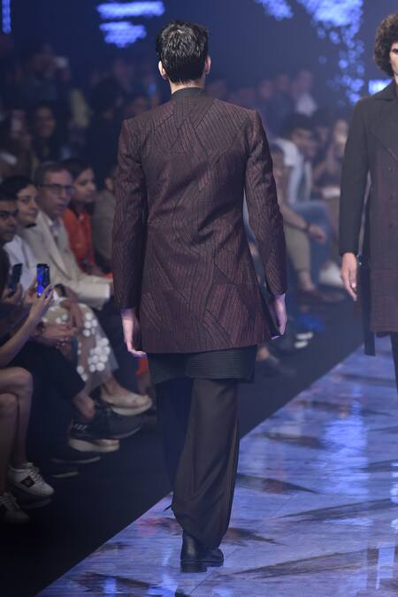 Wine & black long jacket with all-over embroidery. Paired with plain pants.