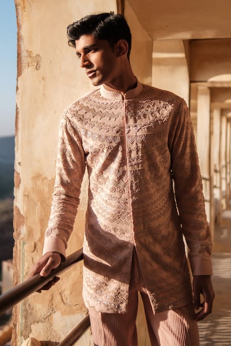 Rose pink kurta featuring intricate embroidery with a stand collar and button closure. Paired with coordinating rose pink pants with a textured finish.