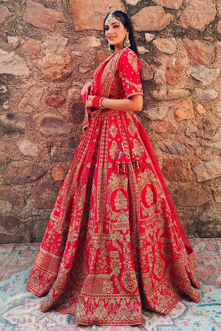 Red Beads, Metallic Thread Round Neck Beaded Bridal Lehenga Set