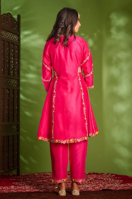 Hot pink short anarkali with multi-color floral embroidery and zardozi embroidery. Comes with straight pants and organza dupatta.