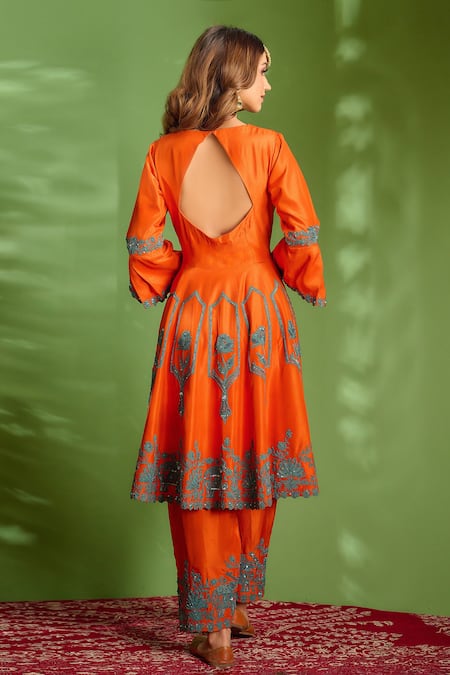 Orange Dupion Silk And Organza Thread & Sequin V Neck Anarkali Set