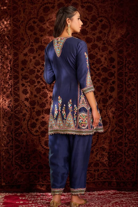 Royal blue short anarkali with multicolor floral embroidery and zardozi work. Comes with salwar and organza dupatta.