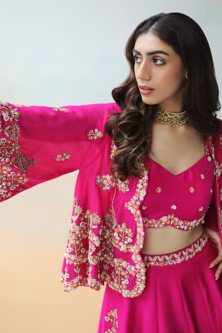 Fuschia pink cape with sequin & floral embroidery. Paired with lehenga & blouse.