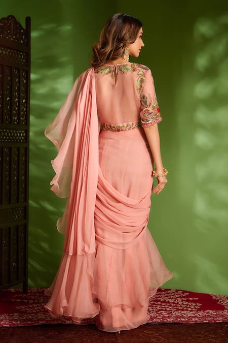 Onion pink georgette saree with ruffle detail and pleated pallu. Comes with embroidered blouse and belt.