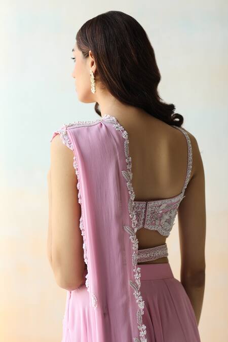 Lilac pre-draped saree with floral embroidery. Paired with blouse & embellished detachable belt.