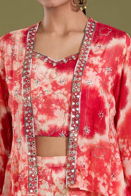 Coral and orange tie dye jacket featuring a mirror and bead embellished placket. Paired with a matching embellished bustier and flared pant.