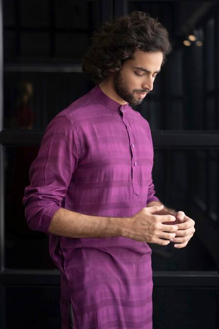 Buy_Hilo Design_Purple Jacquard Striped Amaranth Basik Kurta_at_Aza_Fashions