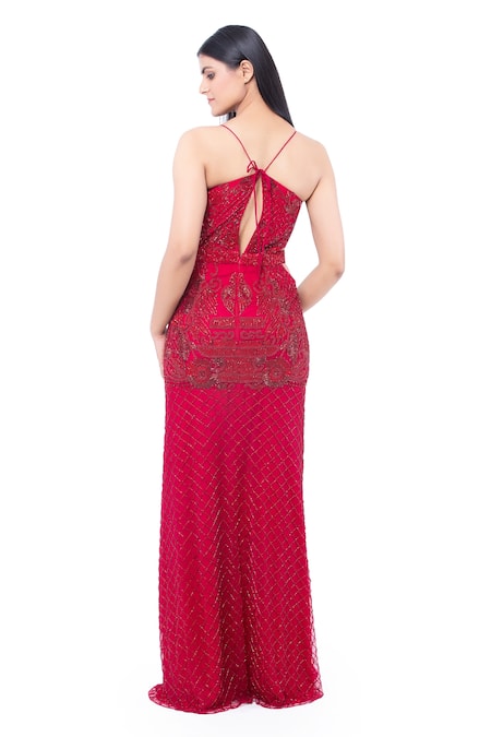 Red sleeveless fitted gown with sequin & cutdana hand embroidery in floral, checkered motifs, side slits & keyhole neckline.