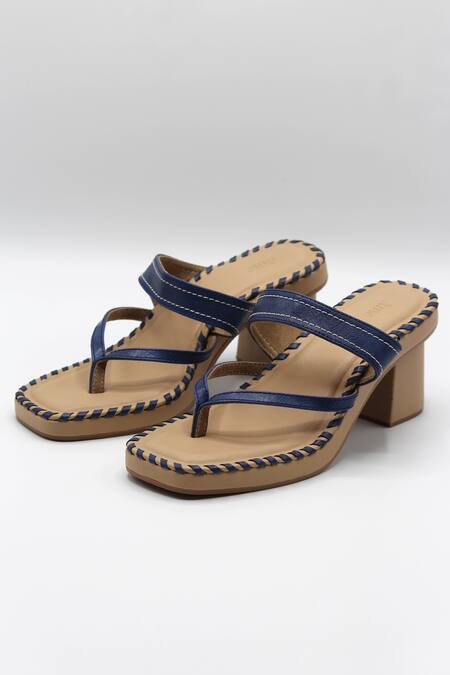 Blue & beige block heels with multi-strap, stitch lines & striped pattern border.