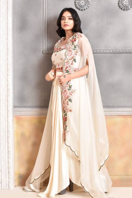 Off white cape featuring scallop trimmed border with multi color floral garden embroidery. Paired with an inner blouse adorned with floret butti embroidery and an asymmetric, pleated, draped skirt.