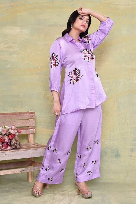 Buy_Amethyst_Purple Linen, Satin Embroidery, Sequins Collared Floral Shirt With Pant_at_Aza_Fashions
