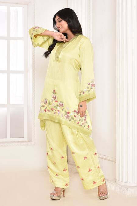 Yellow kurta featuring placement rose bloom embroidery and a V-neckline. Paired with matching pants adorned with scattered floral buttis.