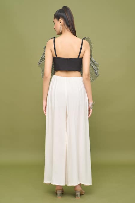 Black crop top featuring butterfly applique embroidery and notched neckline. Paired with relaxed fit flared pant in a contrasting color.