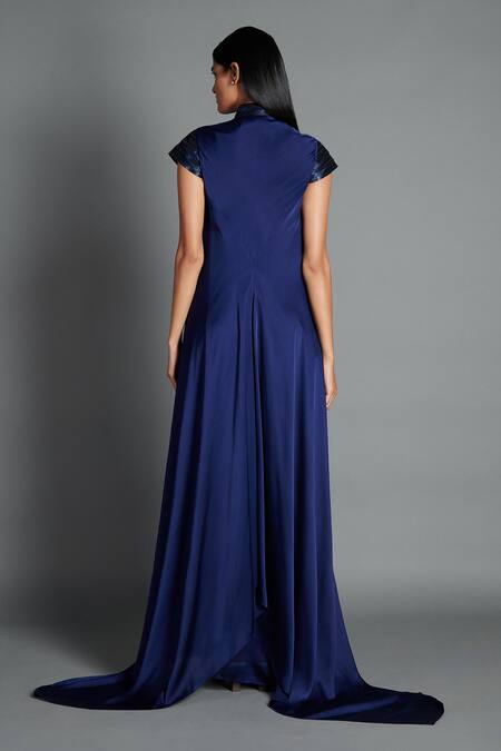 Ink blue draped maxi dress with handwoven metallic yoke, asymmetric layers & trail detail.