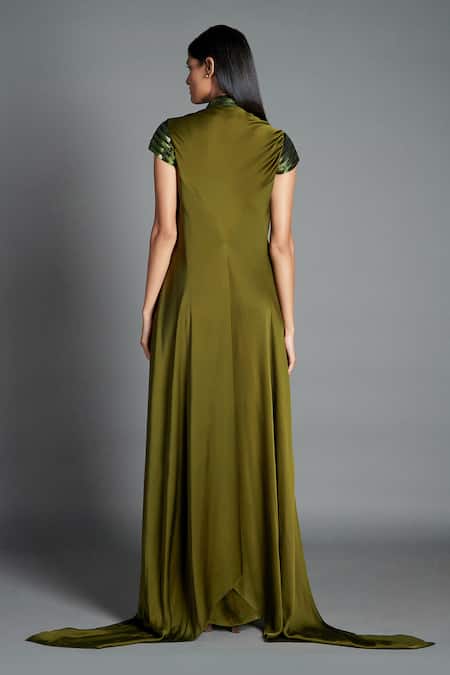 Olive green draped maxi dress with handwoven metallic yoke, asymmetric layers & trail detail.