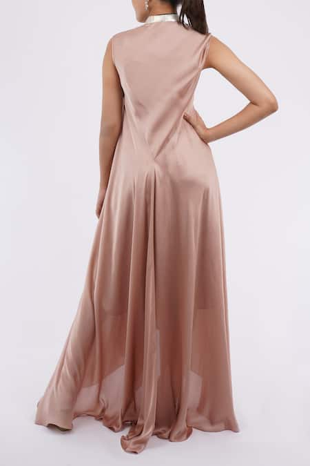 Pink asymmetric maxi dress featuring metallic embellishments and a band collar. Comes with an embellished belt and an inner slip.