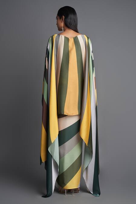 Emerald sunray cape top with cascading hem. Paired with draped pant.