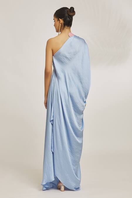 Buy_Amit Aggarwal_Blue Hammered Satin Embroidery Cord One Shoulder Draped Gown