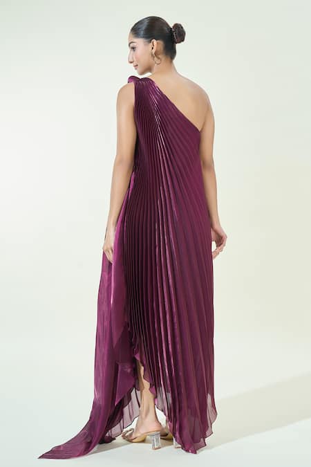 Plum organza base dress featuring metallic micro pleats and a moulded structured shoulder