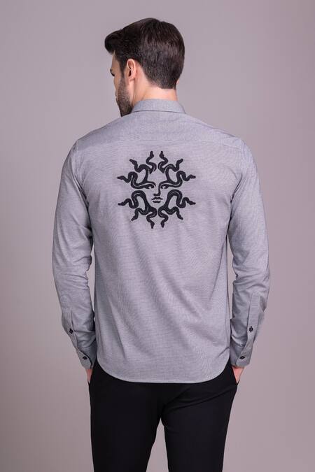 Grey shirt featuring abstract face motif embroidery at the back