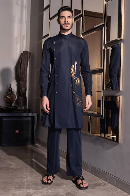 Navy blue kurta featuring abstract sequin embroidery and a band collar. Paired with a coordinating solid aligadhi for a complete look.