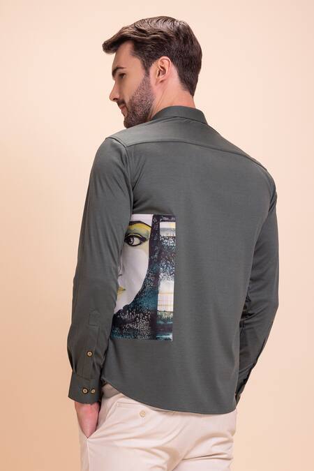 Canvas patchwork details on the front and back, Long cuffed sleeves, Collared neckline