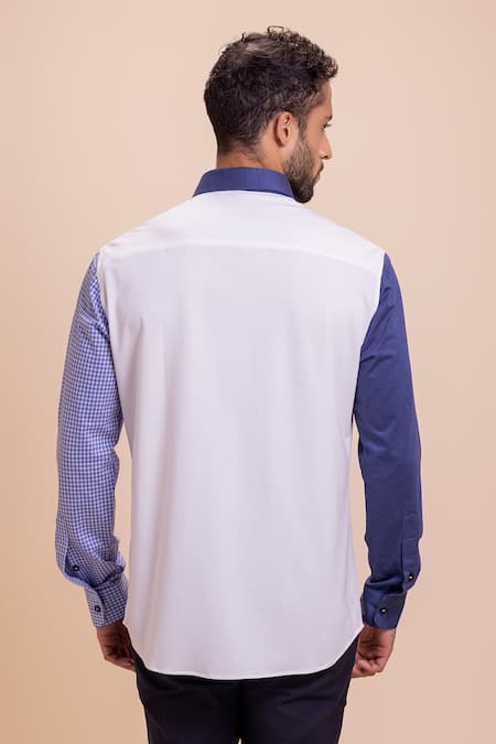Blue and white casual shirt featuring an embroidered pocket and long cuffed sleeves