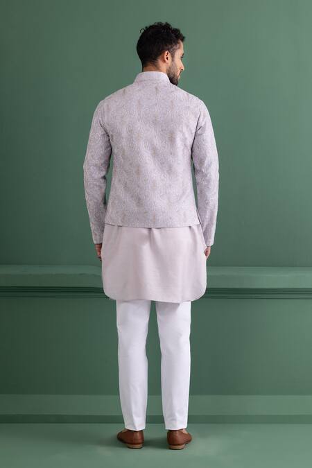 Purple silk bundi featuring tonal floral embroidery. Paired with an inner kurta with embroidery on the sleeves and aligadhi pant.