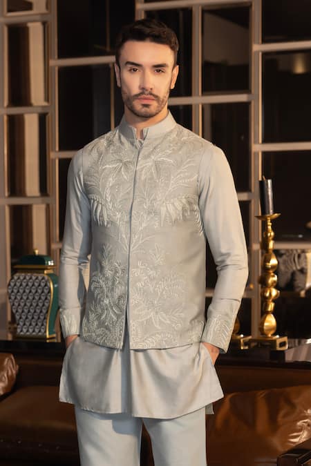 Sequin and thread hand embroidery in floral pattern, Placement embroidered details on kurta, Band collar design on waistcoat